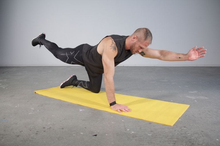 Cuando hagas Bird Dog-ya que no es un ejercicio difícil, sé intencional y mantente enfocada en cada movimiento. Enfócate en mantener tu torso completamente paralelo al piso, y tus caderas y hombros formando un cuadrado.